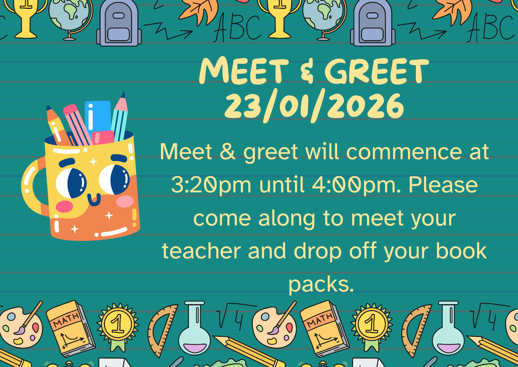 Meet & Greet 23rd January 2026 will commence at 3:20pm until 4:00pm. Please come along to meet your teacher and drop off your book packs.