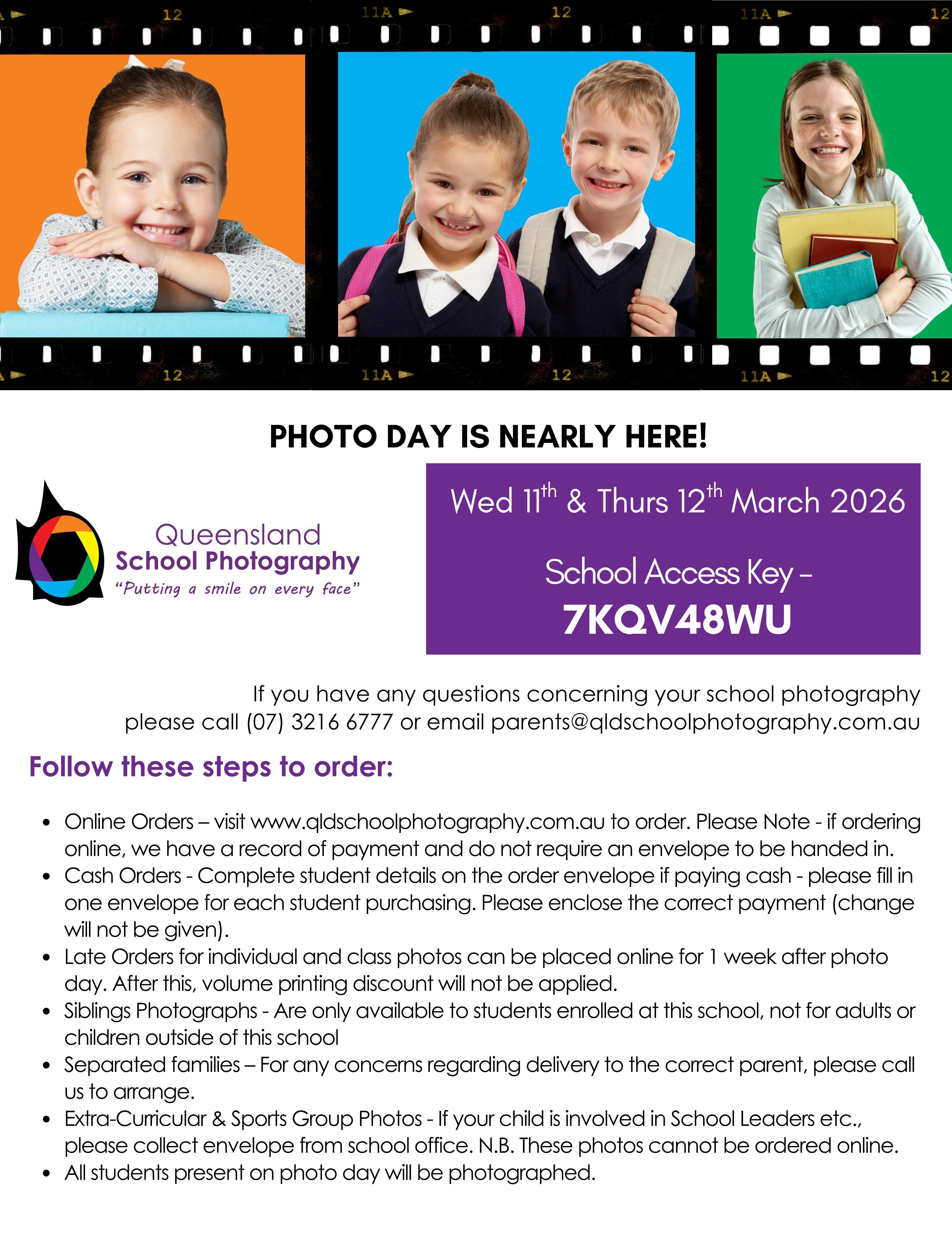 Photo day will be Wednesday 11th and Thursday 12th of March 2026. Please visit www.qldschoolphotography.com.au and use school access code 7KQV48WU to order.